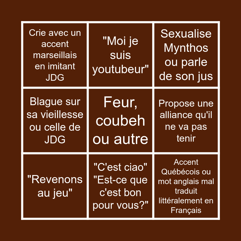 This bingo card has 9 words: "Revenons au jeu", Sexualise Mynthos ou parle de son jus, "Moi je suis youtubeur", Blague sur sa vieillesse ou celle de JDG, Crie avec un accent marseillais en imitant JDG, Propose une alliance qu'il ne va pas tenir, Feur, coubeh ou autre, Accent Québécois ou mot anglais mal traduit littéralement en Français and "C'est ciao" "Est-ce que c'est bon pour vous?".