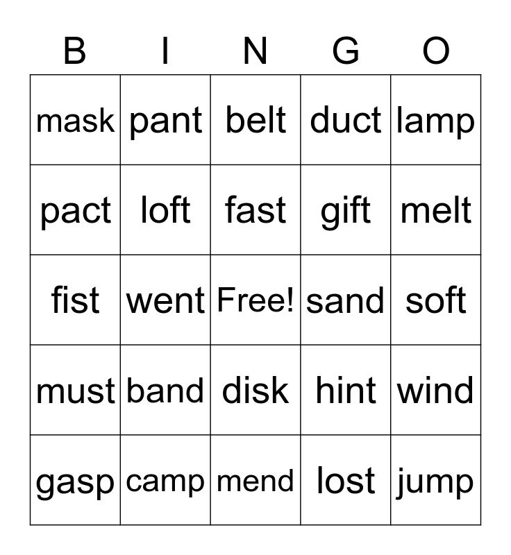This bingo card has a free space and 24 words: band, camp, fast, gasp, lamp, mask, pact, pant, sand, disk, gift, fist, hint, wind, loft, lost, soft, belt, melt, went, jump, must, duct and mend.