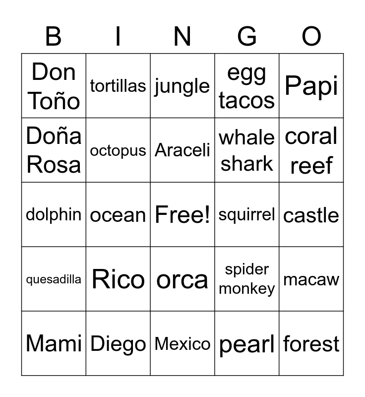 This bingo card has a free space and 24 words: Rico, Diego, Araceli, Mami, Papi, Don Toño, Doña Rosa, tortillas, squirrel, orca, whale shark, dolphin, spider monkey, macaw, octopus, pearl, castle, jungle, coral reef, ocean, forest, quesadilla, egg tacos and Mexico.