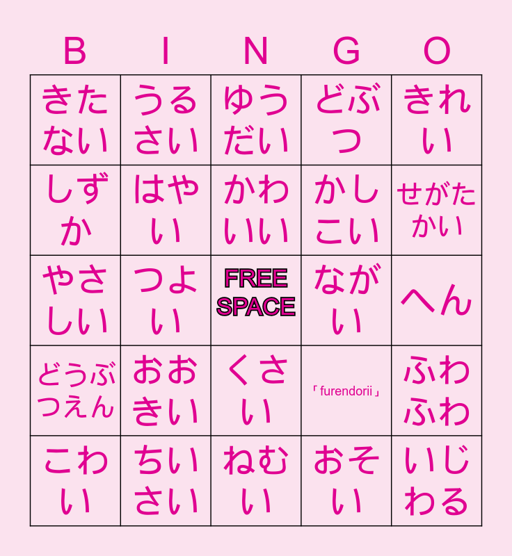 This bingo card has a free space and 24 words: おおきい, ちいさい, かわいい, こわい, きれい, きたない, しずか, うるさい, ながい, くさい, かしこい, やさしい, 「furendorii」, ふわふわ, はやい, おそい, へん, ゆうだい, せがたかい, つよい, いじわる, どうぶつえん, どぶつ and ねむい.