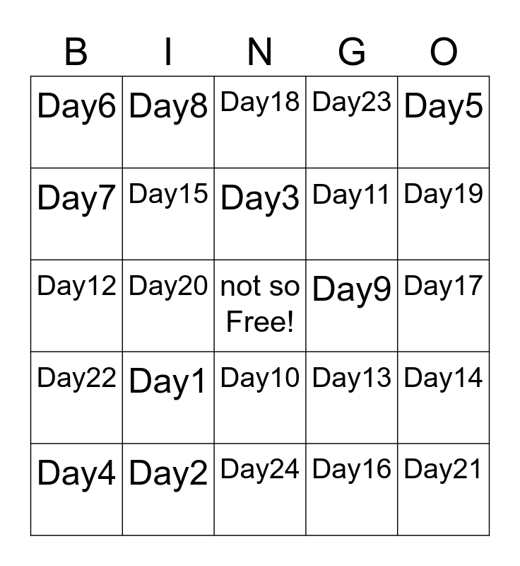 This bingo card has a free space and 24 words: Day1, Day2, Day3, Day4, Day5, Day6, Day7, Day8, Day9, Day10, Day11, Day12, Day13, Day14, Day15, Day16, Day17, Day18, Day19, Day20, Day21, Day22, Day23 and Day24.
