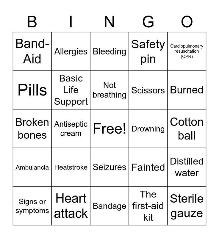 This bingo card has a free space and 34 words: First aid, The first-aid kit, Can you hear me?, How do you feel?, Ambulancia, Basic Life Support, Cardiopulmonary resuscitation (CPR), Signs or symptoms, Allergies, Medications, Not breathing, Bleeding, In shock, Chocking, Drowning, Burned, Heart attack, Broken bones, Heatstroke, Fainted, Seizures, Sprain, Band-Aid, Cotton ball, Bandage, Sterile gauze, Safety pin, Sterile gloves, Scissors, Pills, Antibiotic ointment, Antiseptic cream, Distilled water and Painkillers.