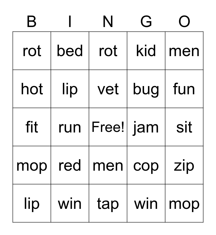 This bingo card has a free space and 48 words: cat, mop, sit, tap, red, fun, bed, mug, hot, hat, lip, kid, zip, cop, dog, nag, vet, jam, fit, men, run, win, rot, bug, cat, fun, lip, dog, men, mop, bed, kid, nag, run, win, vet, mug, sit, tap, hot, zip, jam, rot, bug, fit, cop, hat and red.