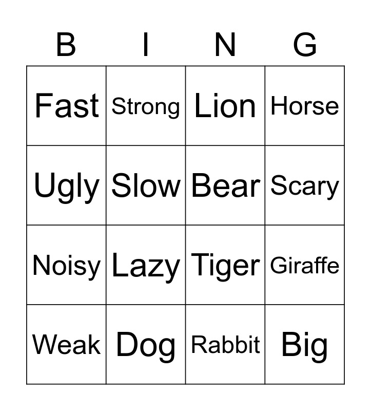 This bingo card has 23 words: Big, Small, Scary, Cute, Ugly, Fast, Slow, Strong, Weak, Playful, Lazy, Noisy, Quiet, Cat, Dog, Elephant, Lion, Tiger, Bear, Giraffe, Horse, Rabbit and Frog.