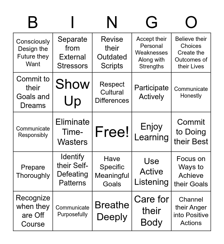 This bingo card has a free space and 24 words: Identify their Self-Defeating Patterns, Communicate Purposefully, Respect Cultural Differences, Recognize when they are Off Course, Believe their Choices Create the Outcomes of their Lives, Consciously Design the Future they Want, Commit to their Goals and Dreams, Separate from External Stressors, Enjoy Learning, Have Specific Meaningful Goals, Participate Actively, Communicate Responsibly, Use Active Listening, Focus on Ways to Achieve their Goals, Show Up, Care for their Body, Commit to Doing their Best, Revise their Outdated Scripts, Communicate Honestly, Eliminate Time-Wasters, Channel their Anger into Positive Actions, Prepare Thoroughly, Accept their Personal Weaknesses Along with Strengths and Breathe Deeply.