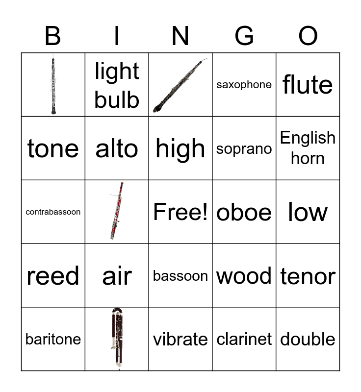 This bingo card has 6 images, a free space and 24 words: alto, bassoon, oboe, vibrate, low, double, clarinet, ligature, English horn, piccolo, wood, reed, air, flute, contrabassoon, metal, light bulb, soprano, tone, saxophone, tenor, baritone, high and single.