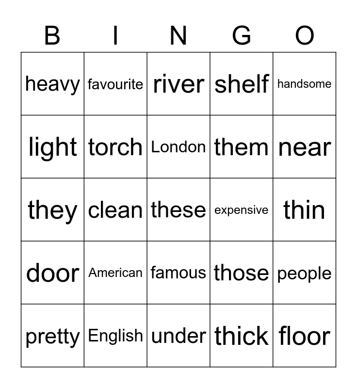 This bingo card has a free space and 24 words: American, English, London, pretty, handsome, heavy, light, favourite, expensive, famous, them, they, those, people, torch, thick, thin, river, near, clean, floor, door, shelf and under.