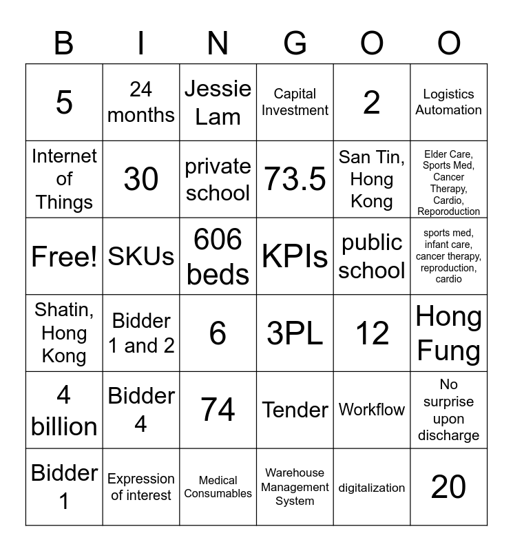 This bingo card has 36 words: Tender, 74, Warehouse Management System, Internet of Things, Shatin, Hong Kong, KPIs, 30, Medical Consumables, 2, Workflow, Elder Care, Sports Med, Cancer Therapy, Cardio, Reporoduction, Capital Investment, No surprise upon discharge, SKUs, 73.5, 5, 4 billion, public school, Free!, Jessie Lam, 606 beds, Bidder 1 and 2, 3PL, 6, 12, 24 months, San Tin, Hong Kong, Expression of interest, private school, Logistics Automation, 20, Bidder 1, Hong Fung, sports med, infant care, cancer therapy, reproduction, cardio, Bidder 4 and digitalization.