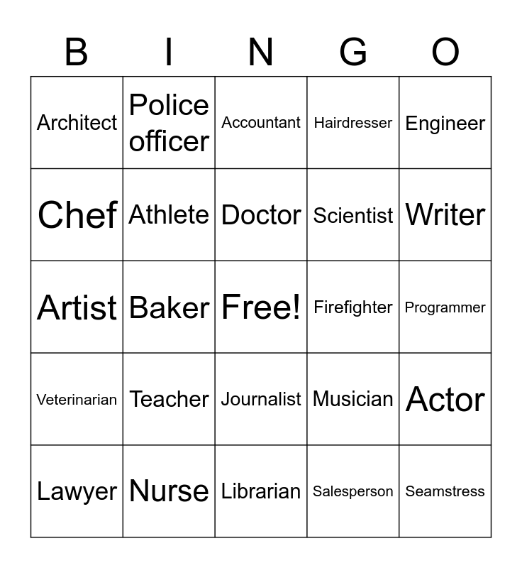 This bingo card has a free space and 24 words: Teacher, Nurse, Doctor, Lawyer, Engineer, Architect, Chef, Police officer, Firefighter, Journalist, Scientist, Artist, Musician, Actor, Athlete, Salesperson, Programmer, Accountant, Writer, Baker, Seamstress, Veterinarian, Hairdresser and Librarian.