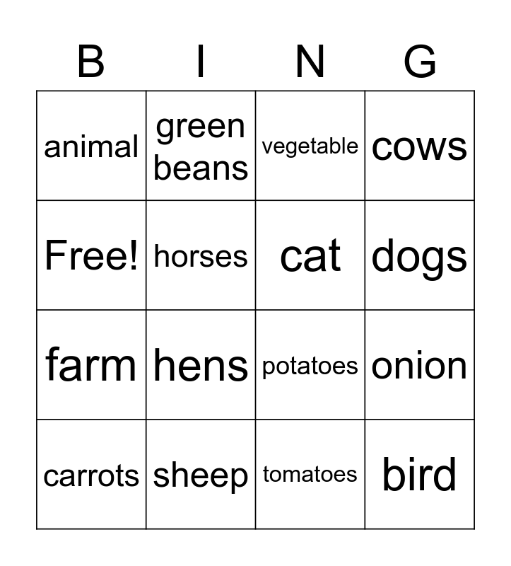 This bingo card has 16 words: sheep, onion, vegetable, animal, farm, green beans, potatoes, tomatoes, Free!, horses, carrots, cows, hens, dogs, cat and bird.