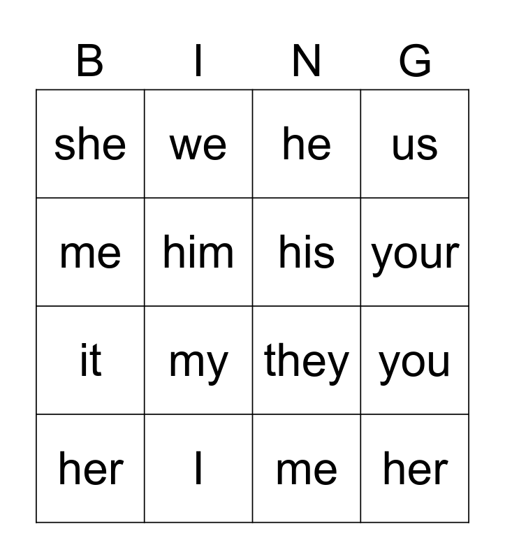 This bingo card has 16 words: I, you, he, she, it, we, they, me, me, him, her, us, my, your, his and her.