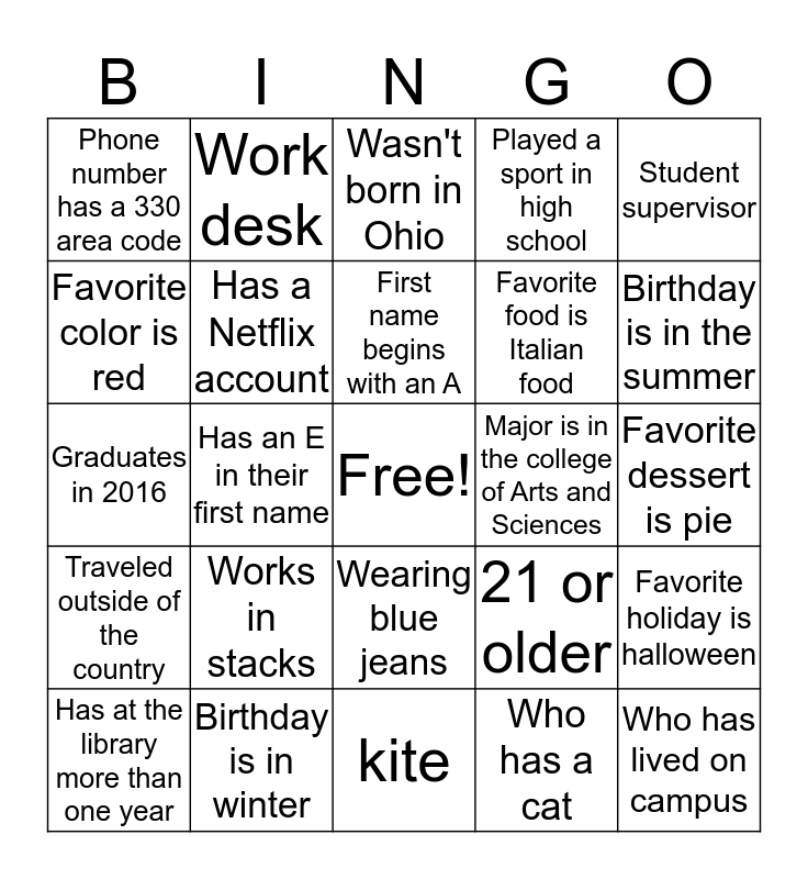 This bingo card has a free space and 24 words: Works in stacks, Birthday is in winter, First name begins with an A, Has at the library more than one year, Student supervisor, Phone number has a 330 area code, Favorite color is red, Work desk, Major is in the college of Arts and Sciences, Wearing blue jeans, Favorite food is Italian food, Graduates in 2016, 21 or older, Favorite holiday is halloween, Has a Netflix account, Who has a cat, Favorite dessert is pie, Wasn't born in Ohio, Birthday is in the summer, Has an E in their first name, Who has lived on campus, Traveled outside of the country, Played a sport in high school and kite.