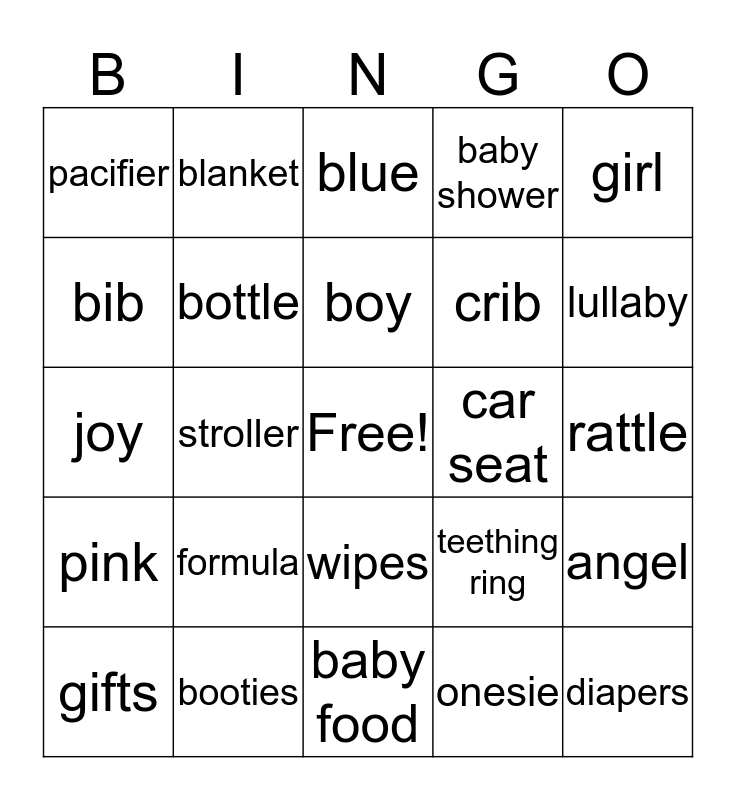 This bingo card has a free space and 24 words: formula, booties, boy, gifts, girl, pacifier, bib, blanket, car seat, wipes, crib, joy, teething ring, angel, bottle, onesie, rattle, blue, lullaby, stroller, diapers, pink, baby shower and baby food.