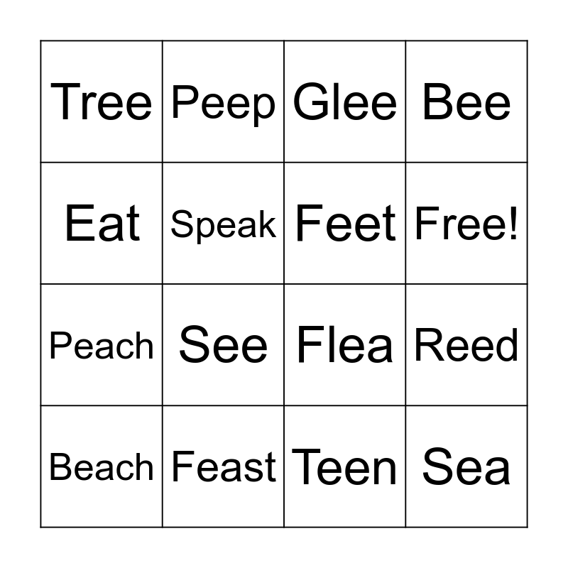 This bingo card has 18 words: See, Sea, Glee, Tree, Flea, Bee, Beach, Peep, Free!, Peach, Teen, Eat, Reed, Speak, Feet, Seal, Feast and Eel.