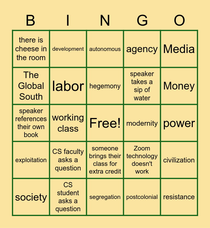 This bingo card has a free space and 44 words: justice, CS faculty asks a question, intersectionality, postcolonial, Marx, capital, labor, imperialism, agency, resistance, there is cheese in the room, CS student asks a question, Zoom technology doesn't work, power, someone's cat shows up in the zoom, structure, segregation, modernity, politics, speaker references their own book, development, someone brings their class for extra credit, globalization, Media, Foucault, Overdetermined, hegemony, colonization, civilization, society, dialectical, autonomous, articulation, Mexico, exploitation, Trump, democrats, conservative, Money, The Global South, working class, America/U.S., speaker takes a sip of water and someone comes in late.