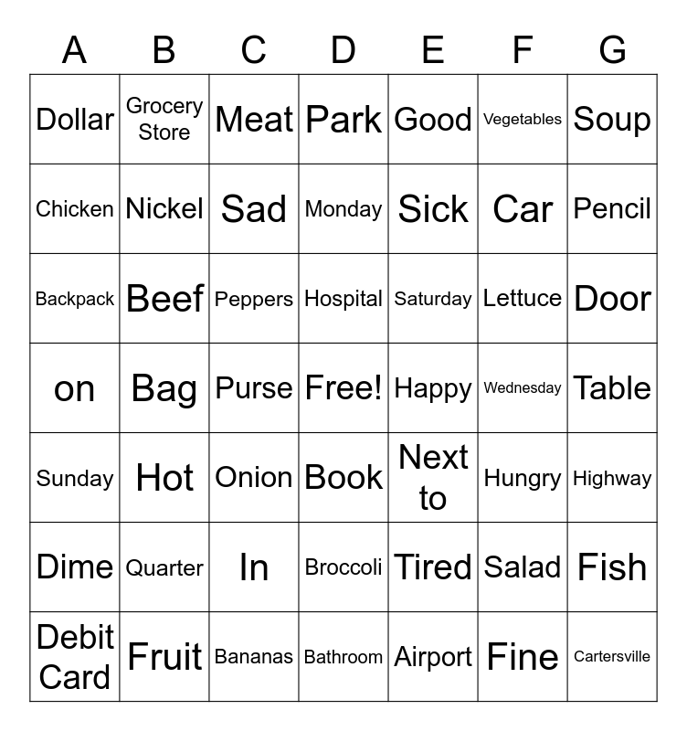This bingo card has a free space and 69 words: Box, Backpack, Chair, Hungry, on, Wallet, Park, Fish, Good, Phone, Lettuce, Bananas, Dollar, Meat, Restaurant, Sick, Hospital, Nickel, Paper, Beef, Pencil, Saturday, Sad, Wednesday, Hot, Broccoli, Quarter, In, Purse, Salad, Grocery Store, Fruit, Apples, Window, Next to, Book, Bathroom, Sunday, Vegetables, Cartersville, Peppers, Car, Table, Oranges, Across from, Door, Highway, Airport, Cold, Soup, Chicken, Credit Card, Onion, Bag, Church, Bank, Plane, Pork, Happy, Monday, School, Tuesday, Debit Card, Dime, Tired, Thursday, Fine, Friday and Penny.