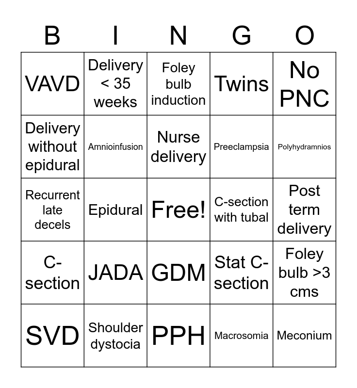 This bingo card has a free space and 27 words: Stat C-section, Oligohydramnios, Preeclampsia, PPH, Delivery without epidural, Foley bulb induction, Delivery < 35 weeks, C-section, C-section with tubal, Foley bulb >3 cms, Recurrent late decels, Twins, SVD, Shoulder dystocia, Polyhydramnios, Precip delivery, Amnioinfusion, Nurse delivery, JADA, VAVD, Post term delivery, Macrosomia, Epidural, Meconium, GDM, No PNC and Primary C-section d/t failed induction..