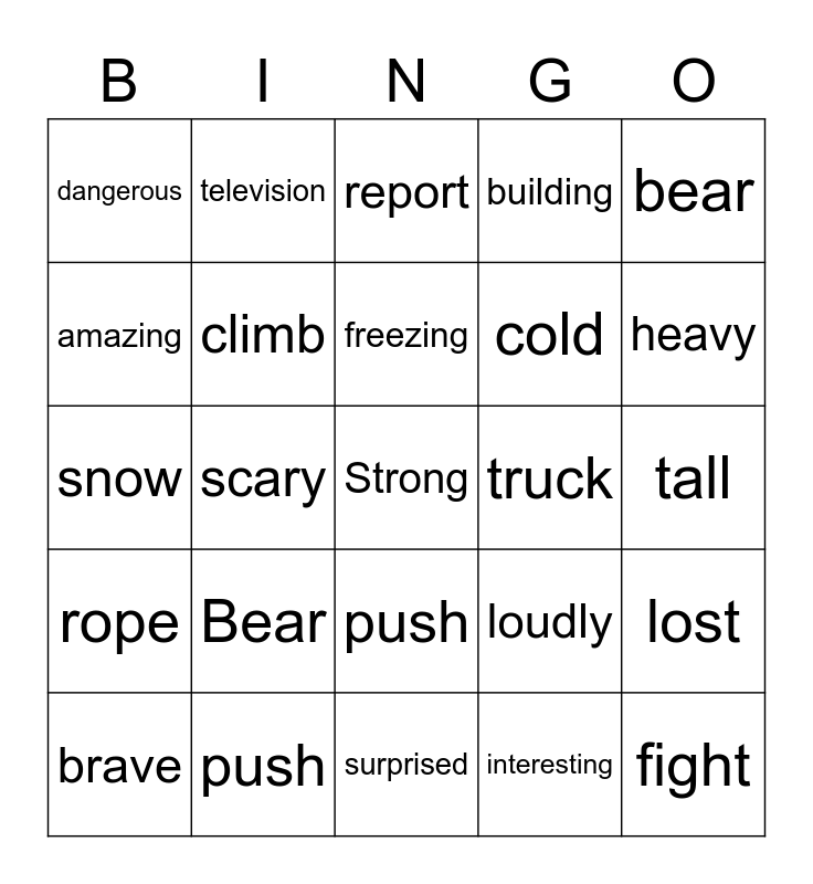 This bingo card has a free space and 24 words: Bear, push, freezing, brave, bear, dangerous, amazing, television, truck, push, cold, snow, loudly, lost, climb, interesting, tall, report, heavy, scary, fight, rope, building and surprised.