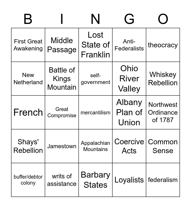 This bingo card has a free space and 24 words: Jamestown, writs of assistance, self-government, buffer/debtor colony, theocracy, First Great Awakening, New Netherland, Middle Passage, Albany Plan of Union, Appalachian Mountains, Ohio River Valley, French, Coercive Acts, Common Sense, Battle of Kings Mountain, Loyalists, Northwest Ordinance of 1787, Lost State of Franklin, Whiskey Rebellion, Great Compromise, federalism, Shays' Rebellion, Anti-Federalists and Barbary States.