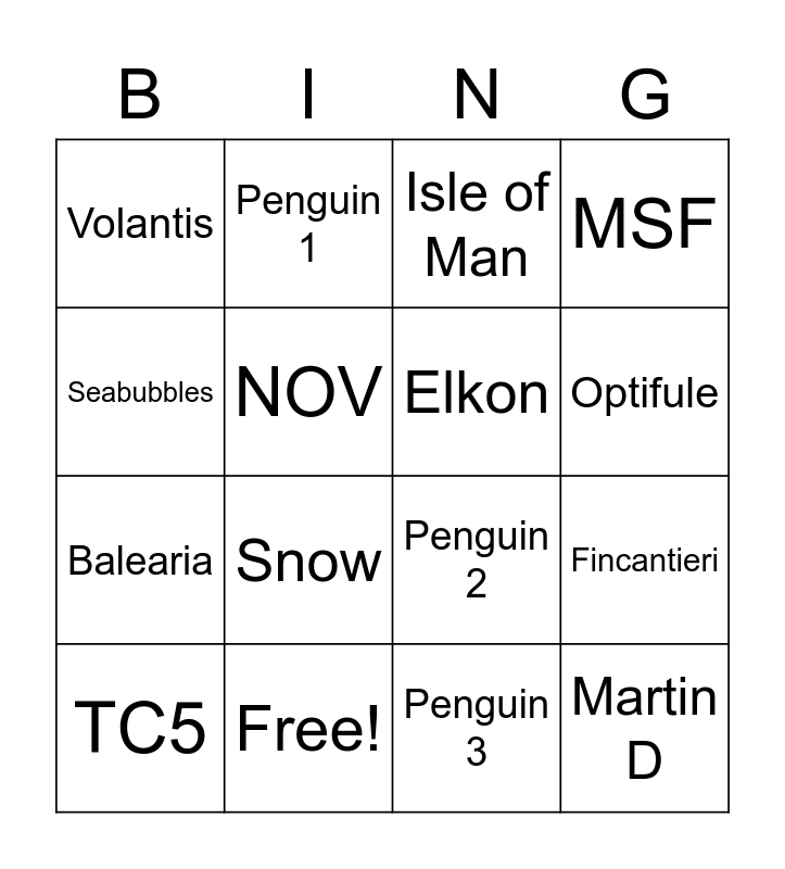 This bingo card has 16 words: Free!, Fincantieri, Isle of Man, Volantis, Balearia, Penguin 1, Penguin 2, Penguin 3, Seabubbles, NOV, TC5, MSF, Snow, Optifule, Elkon and Martin D.