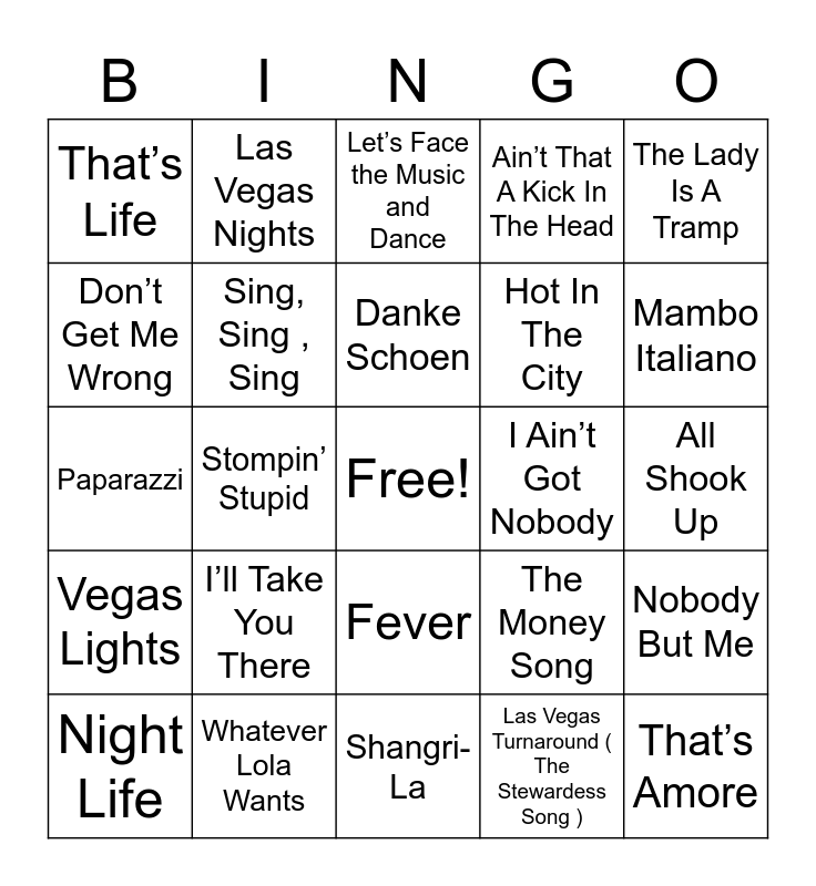 This bingo card has a free space and 69 words: Zoot Suit Riot, All Shook Up, Volare, I’ve Got the World on a String, Whatever Lola Wants, Jump, Jive, An ‘Wail, Ain’t That A Kick In The Head, I Won’t Dance, The Lady Is A Tramp, Sway ( Quien Sera), Nobody But Me, Fly Me To the Moon, That’s Life, Let’s Face the Music and Dance, For Once In My Life, Stompin’ Stupid, Fever, Hot In The City, 24k Magic, Vegas Lights, I Ain’t Got Nobody, The Money Song, Mambo Italiano, Flesh For Fantasy, Dream On, The 9th Island ( Las Vegas), Waking Up In Vegas, Love And Marriage, Las Vegas Turnaround ( The Stewardess Song ), My Kinda Party, Las Vegas Nights, Working For The Weekend, Born To Be Alive, Diamonds Are Forever, Pennies From Heaven, Angelina /Zooma Zooma, Sandunga, Cheek To Cheek, Don’t Get Me Wrong, What I Like About You, I’ll Take You There, That’s Amore, Hey Pachuco!, King Of Swing, Hello, Dolly!, Night Life, Goody Goody, It Don’t Mean A Thing ( If It Ain’t Got That Swing ), Recipe For Love, Sing, Sing , Sing, Danke Schoen, Putting on the Ritz, Vegas, Shangri-La, Big Spender, Bamboleo, House Of The Rising Sun, Let the Good Times Roll, Poker Face, Paparazzi, Promised Land, A little less Conversation, Cabaret, She’s A Lady, Summer, Money, Money, Money, Jump In The Line, Too Darn Hot and What’s New Pussycat?.