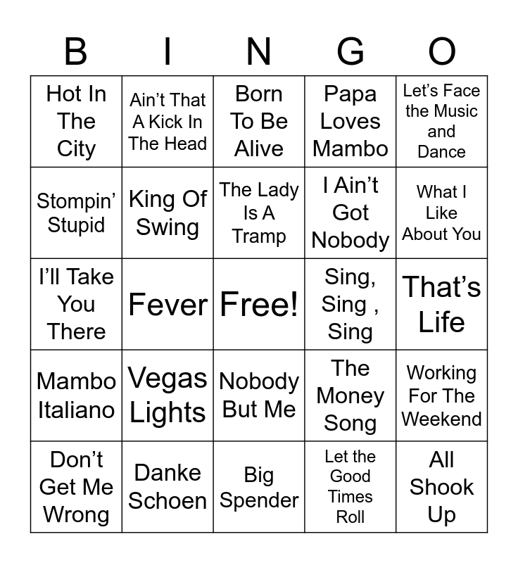 This bingo card has a free space and 68 words: Zoot Suit Riot, All Shook Up, Volare, I’ve Got the World on a String, Whatever Lola Wants, Jump, Jive, An ‘Wail, Ain’t That A Kick In The Head, I Won’t Dance, The Lady Is A Tramp, Sway ( Quien Sera), Nobody But Me, Fly Me To the Moon, That’s Life, Let’s Face the Music and Dance, For Once In My Life, Stompin’ Stupid, Fever, Hot In The City, 24k Magic, Vegas Lights, I Ain’t Got Nobody, The Money Song, Mambo Italiano, The 9th Island ( Las Vegas), Waking Up In Vegas, Love And Marriage, Las Vegas Turnaround ( The Stewardess Song ), Las Vegas Nights, Working For The Weekend, Mack the Knife, Born To Be Alive, Diamonds Are Forever, Pennies From Heaven, Angelina /Zooma Zooma, Papa Loves Mambo, Sandunga, Cheek To Cheek, Don’t Get Me Wrong, What I Like About You, I’ll Take You There, That’s Amore, Hey Pachuco!, King Of Swing, Hello, Dolly!, Night Life, Goody Goody, It Don’t Mean A Thing ( If It Ain’t Got That Swing ), Recipe For Love, Sing, Sing , Sing, Danke Schoen, Putting on the Ritz, Vegas, Shangri-La, Big Spender, Bamboleo, House Of The Rising Sun, Let the Good Times Roll, Poker Face, Paparazzi, Promised Land, A little less Conversation, Cabaret, She’s A Lady, That’s What I Like, Money, Money, Money, Jump In The Line, Too Darn Hot and What’s New Pussycat?.
