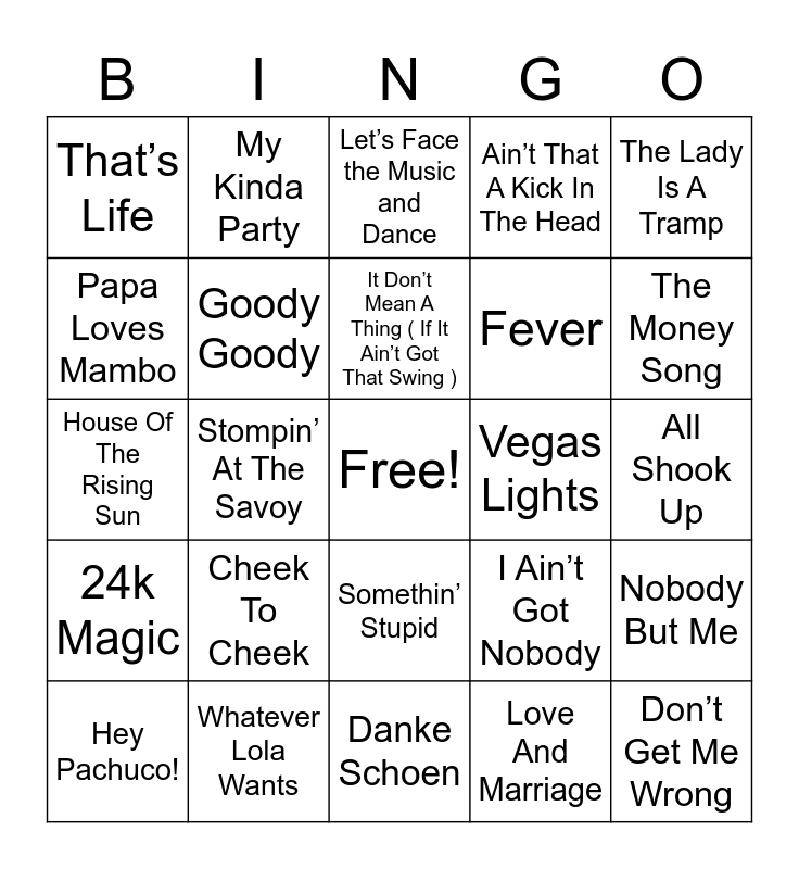 This bingo card has a free space and 69 words: Zoot Suit Riot, All Shook Up, Volare, I’ve Got the World on a String, Whatever Lola Wants, Jump, Jive, An ‘Wail, Ain’t That A Kick In The Head, I Won’t Dance, The Lady Is A Tramp, Sway ( Quien Sera), Nobody But Me, Fly Me To the Moon, That’s Life, Let’s Face the Music and Dance, For Once In My Life, Stompin’ At The Savoy, Somethin’ Stupid, Fever, Hot In The City, 24k Magic, Vegas Lights, I Ain’t Got Nobody, The Money Song, Mambo Italiano, Flesh For Fantasy, Dream On, The 9th Island ( Las Vegas), Waking Up In Vegas, Love And Marriage, Las Vegas Turnaround ( The Stewardess Song ), My Kinda Party, Las Vegas Nights, Working For The Weekend, Mack the Knife, Born To Be Alive, Diamonds Are Forever, Pennies From Heaven, Angelina /Zooma Zooma, Papa Loves Mambo, Sandunga, Cheek To Cheek, Don’t Get Me Wrong, What I Like About You, I’ll Take You There, That’s Amore, Hey Pachuco!, King Of Swing, Hello, Dolly!, Night Life, Goody Goody, It Don’t Mean A Thing ( If It Ain’t Got That Swing ), Recipe For Love, Sing, Sing , Sing, Danke Schoen, Putting on the Ritz, Vegas, Shangri-La, Big Spender, Bamboleo, House Of The Rising Sun, Let the Good Times Roll, Poker Face, Paparazzi, Promised Land, Summer, Money, Money, Money, Jump In The Line, Too Darn Hot and What’s New Pussycat?.