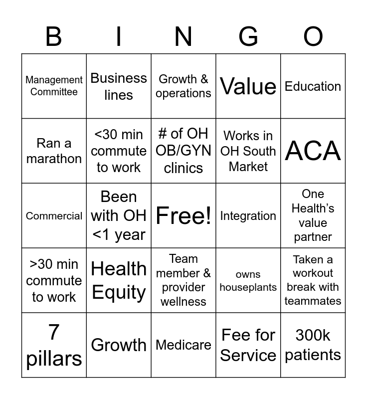 This bingo card has a free space and 45 words: 2026 OH Goals, 300k patients, Strong Value performance, 7 pillars, All teammates/APP employed by One Health, Fee for Service, Growth & operations, Consumerism, Education, Growth, Value, Integration, Team member & provider wellness, Health Equity, Business Strategies, Medicare, Medicaid, Commercial, Direct to Employer, ACA, Business lines, Population health, Wellness, Management Committee, IGB Members, One Health’s value partner, # of One Health providers, Drinks coffee every morning, owns houseplants, >30 min commute to work, Works in OH North Market, Taken a workout break with teammates, Knows # of providers at their office, Have lived outside of North Carolina, Works in OH Winston Market, Been with OH <1 year, Traveled outside of the U.S., Been with OH >1 year, Loves Mexican Food, # of OH OB/GYN clinics, Ran a marathon, Works in OH South Market, Owns a pet, <30 min commute to work and Has worked in more than OH location.