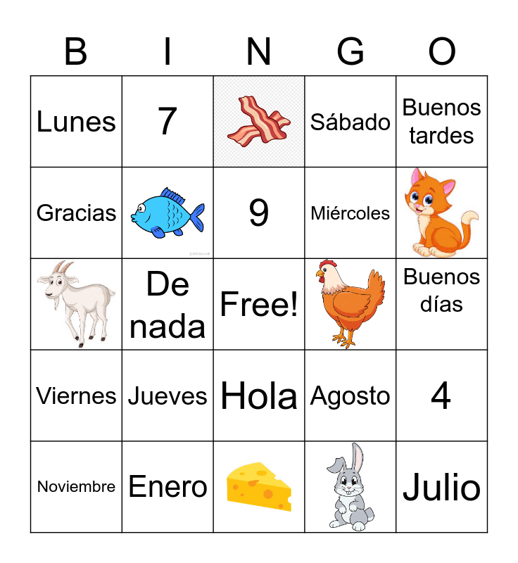 This bingo card has 29 images, a free space and 36 words: 1, 2, 3, 4, 5, 6, 7, 8, 9, 10, Hola, Adíos, Buenos días, Buenos tardes, Buenos noches, Gracias, De nada, Lunes, Martes, Miércoles, Jueves, Viernes, Sábado, Domingo, Marzo, Mayo, Septiembre, Deciembre, Julio, Octubre, Noviembre, Feburero, Abril, Junio, Agosto and Enero.