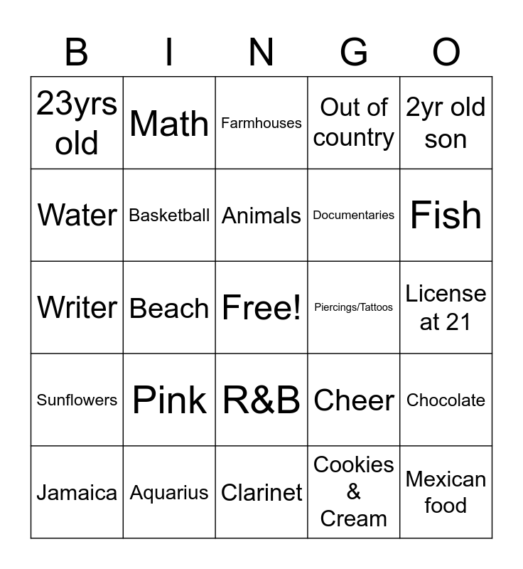 This bingo card has a free space and 24 words: Pink, Aquarius, Animals, Jamaica, 2yr old son, 23yrs old, Water, Math, Piercings/Tattoos, R&B, Documentaries, Writer, Cheer, Chocolate, Basketball, Cookies & Cream, License at 21, Farmhouses, Fish, Beach, Mexican food, Sunflowers, Out of country and Clarinet.