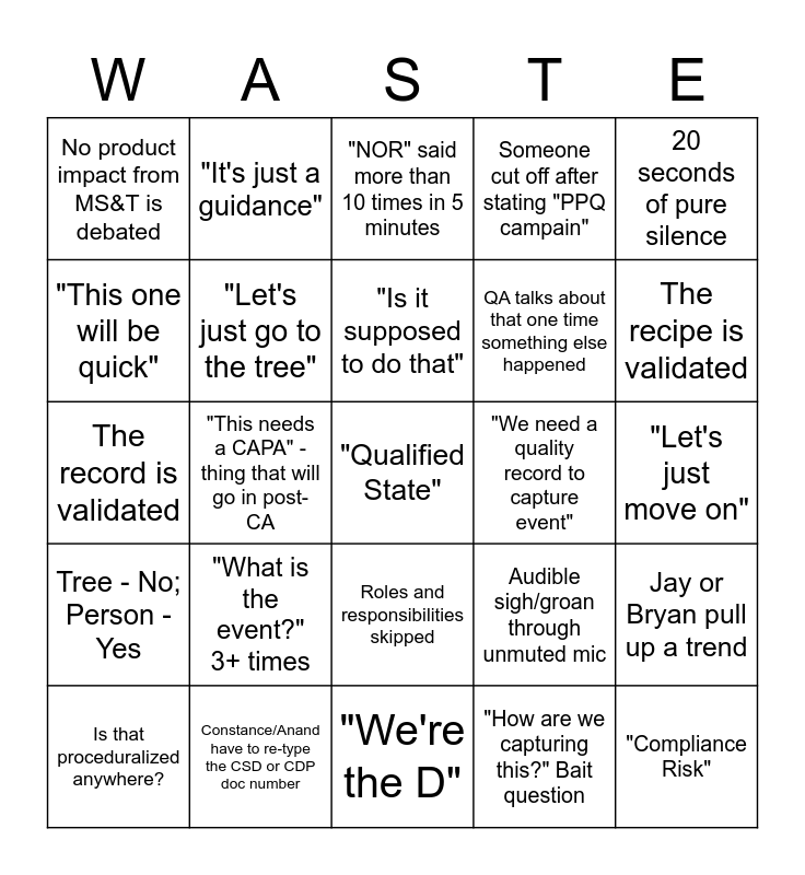 This bingo card has a free space and 24 words: Is that proceduralized anywhere?, "What is the event?" 3+ times, "Is it supposed to do that", "How are we capturing this?" Bait question, 20 seconds of pure silence, No product impact from MS&T is debated, "It's just a guidance", "NOR" said more than 10 times in 5 minutes, "We need a quality record to capture event", "Let's just move on", The record is validated, "Let's just go to the tree", Audible sigh/groan through unmuted mic, Jay or Bryan pull up a trend, "This one will be quick", Constance/Anand have to re-type the CSD or CDP doc number, "We're the D", Someone cut off after stating "PPQ campain", The recipe is validated, Tree - No; Person - Yes, "This needs a CAPA" - thing that will go in post-CA, Roles and responsibilities skipped, QA talks about that one time something else happened and "Compliance Risk".