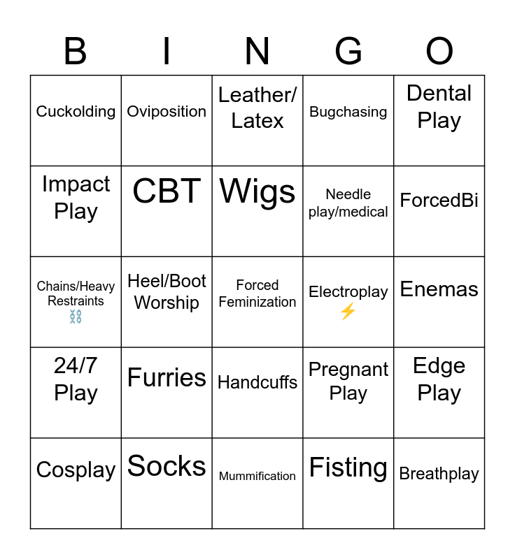 This bingo card has a free space and 24 words: Furries, Socks, Wigs, Cosplay, Dental Play, Cuckolding, Impact Play, Oviposition, Electroplay ⚡️, Handcuffs, Needle play/medical, Chains/Heavy Restraints ⛓, Pregnant Play, Edge Play, CBT, Fisting, Enemas, Leather/ Latex, ForcedBi, Heel/Boot Worship, Breathplay, 24/7 Play, Bugchasing and Mummification.