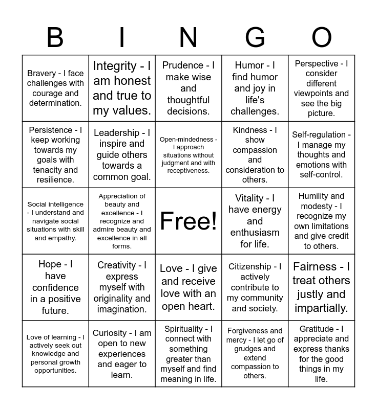 This bingo card has a free space and 24 words: Creativity - I express myself with originality and imagination., Curiosity - I am open to new experiences and eager to learn., Open-mindedness - I approach situations without judgment and with receptiveness., Love of learning - I actively seek out knowledge and personal growth opportunities., Perspective - I consider different viewpoints and see the big picture., Bravery - I face challenges with courage and determination., Persistence - I keep working towards my goals with tenacity and resilience., Integrity - I am honest and true to my values., Vitality - I have energy and enthusiasm for life., Love - I give and receive love with an open heart., Kindness - I show compassion and consideration to others., Social intelligence - I understand and navigate social situations with skill and empathy., Citizenship - I actively contribute to my community and society., Fairness - I treat others justly and impartially., Leadership - I inspire and guide others towards a common goal., Forgiveness and mercy - I let go of grudges and extend compassion to others., Humility and modesty - I recognize my own limitations and give credit to others., Prudence - I make wise and thoughtful decisions., Self-regulation - I manage my thoughts and emotions with self-control., Appreciation of beauty and excellence - I recognize and admire beauty and excellence in all forms., Gratitude - I appreciate and express thanks for the good things in my life., Hope - I have confidence in a positive future., Humor - I find humor and joy in life's challenges. and Spirituality - I connect with something greater than myself and find meaning in life..