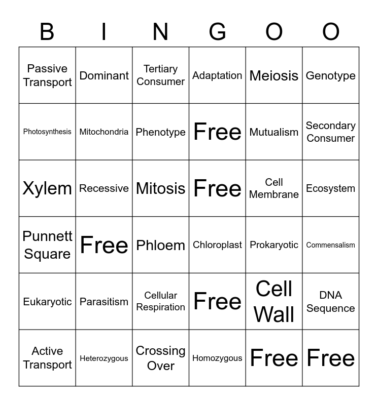 This bingo card has 36 words: Free, Cellular Respiration, Homozygous, Photosynthesis, Punnett Square, Free, Mitochondria, Crossing Over, Meiosis, Cell Wall, Secondary Consumer, Adaptation, DNA Sequence, Recessive, Free, Passive Transport, Eukaryotic, Cell Membrane, Xylem, Tertiary Consumer, Mitosis, Free, Chloroplast, Phloem, Prokaryotic, Dominant, Mutualism, Heterozygous, Phenotype, Genotype, Free, Active Transport, Commensalism, Ecosystem, Parasitism and Free.
