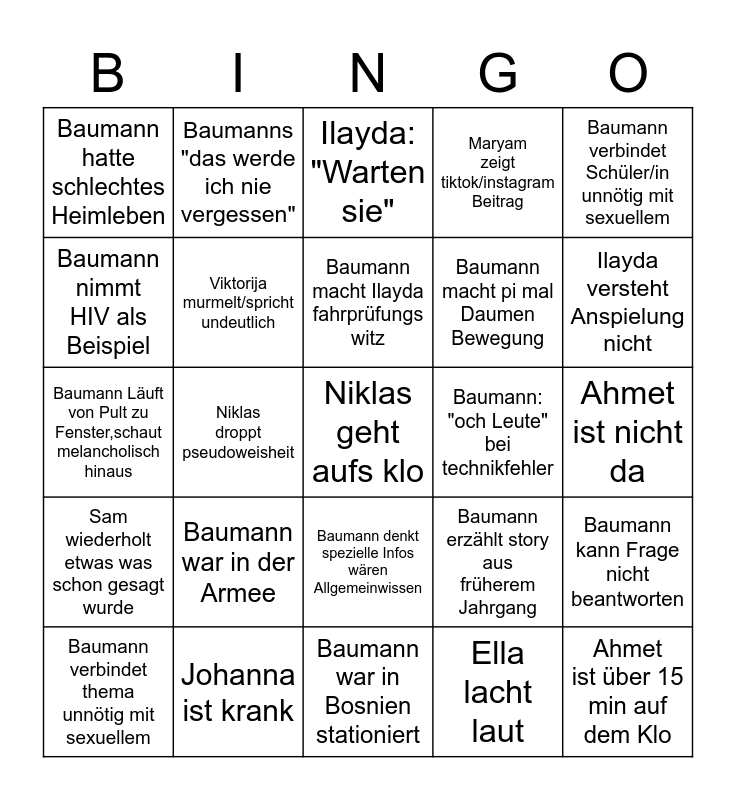 This bingo card has 25 words: Baumann war in der Armee, Baumann war in Bosnien stationiert, Baumann macht Ilayda fahrprüfungs witz, Baumann verbindet thema unnötig mit sexuellem, Baumann verbindet Schüler/in unnötig mit sexuellem, Baumann hatte schlechtes Heimleben, Baumann nimmt HIV als Beispiel, Baumanns "das werde ich nie vergessen", Baumann: "och Leute" bei technikfehler, Baumann denkt spezielle Infos wären Allgemeinwissen, Baumann macht pi mal Daumen Bewegung, Baumann Läuft von Pult zu Fenster,schaut melancholisch hinaus, Baumann erzählt story aus früherem Jahrgang, Baumann kann Frage nicht beantworten, Viktorija murmelt/spricht undeutlich, Ahmet ist über 15 min auf dem Klo, Ahmet ist nicht da, Ilayda: "Warten sie", Ilayda versteht Anspielung nicht, Niklas droppt pseudoweisheit, Niklas geht aufs klo, Johanna ist krank, Sam wiederholt etwas was schon gesagt wurde, Maryam zeigt tiktok/instagram Beitrag and Ella lacht laut.