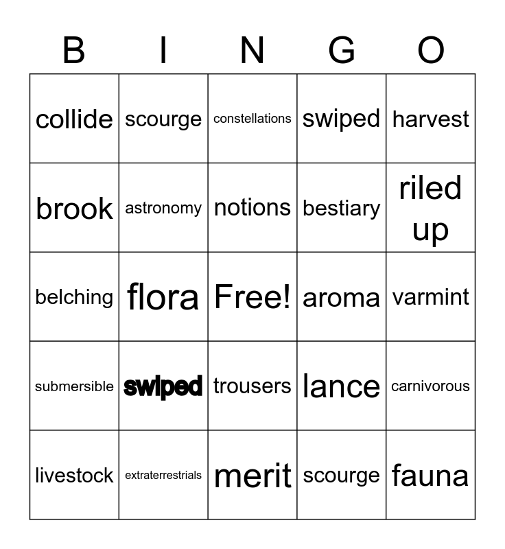 This bingo card has a free space and 25 words: swiped, merit, notions, livestock, harvest, collide, brook, scourge, aroma, trousers, bestiary, belching, lance, carnivorous, astronomy, sinewy, varmint, constellations, riled up, flora, fauna, extraterrestrials, submersible, swiped and scourge.