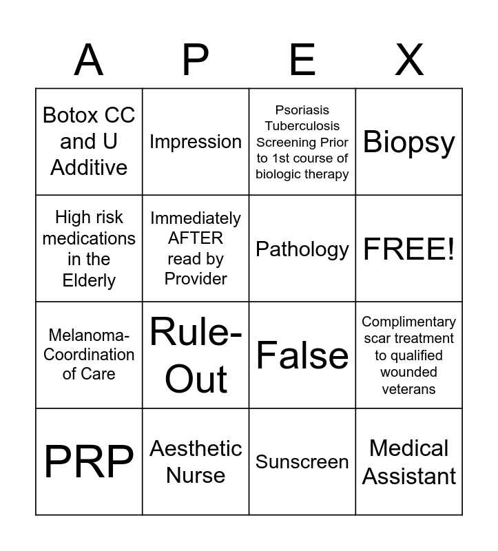 This bingo card has 16 words: PRP, Aesthetic Nurse, Psoriasis Tuberculosis Screening Prior to 1st course of biologic therapy, Biopsy, High risk medications in the Elderly, Impression, False, Complimentary scar treatment to qualified wounded veterans, Botox CC and U Additive, Immediately AFTER read by Provider, Sunscreen, FREE!, Melanoma- Coordination of Care, Rule-Out, Pathology and Medical Assistant.