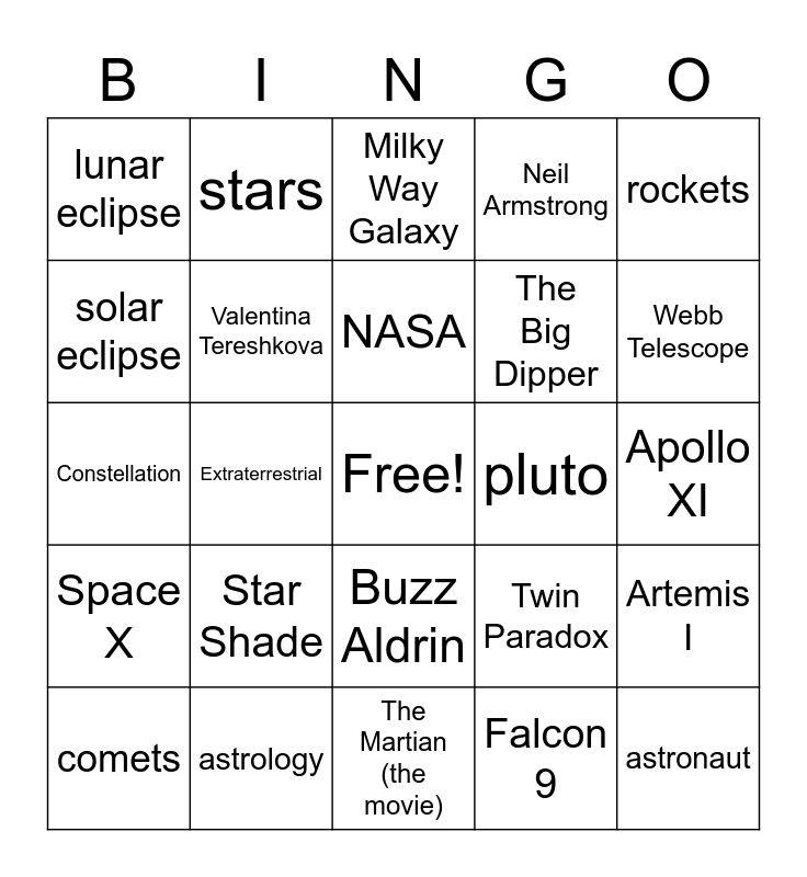 This bingo card has a free space and 24 words: Star Shade, astrology, NASA, comets, rockets, lunar eclipse, solar eclipse, stars, pluto, Buzz Aldrin, The Big Dipper, Constellation, Twin Paradox, Artemis I, Valentina Tereshkova, Falcon 9, Apollo XI, Milky Way Galaxy, Webb Telescope, Extraterrestrial, astronaut, Space X, Neil Armstrong and The Martian (the movie).