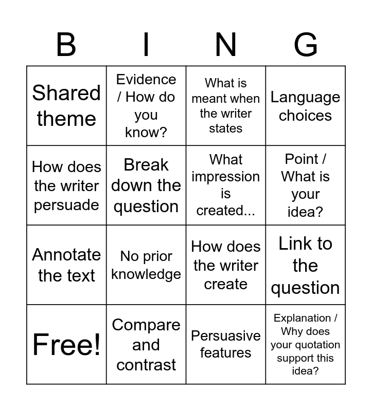 This bingo card has 16 words: Compare and contrast, Link to the question, What is meant when the writer states, Shared theme, Annotate the text, Evidence / How do you know?, How does the writer create, Persuasive features, How does the writer persuade, Break down the question, Free!, Language choices, No prior knowledge, Point / What is your idea?, What impression is created... and Explanation / Why does your quotation support this idea?.