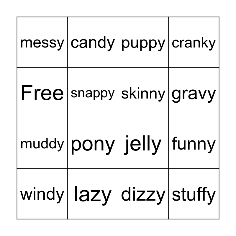 This bingo card has 16 words: lazy, funny, puppy, messy, muddy, candy, jelly, dizzy, Free, snappy, windy, cranky, pony, gravy, skinny and stuffy.
