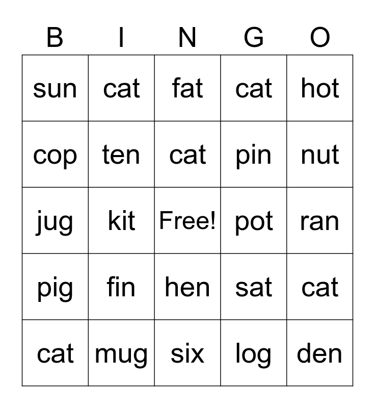 This bingo card has a free space and 29 words: cat, vet, kit, pop, sun, fat, ten, fin, pot, mug, ran, den, six, log, nut, tan, hen, pig, hot, jug, sat, wet, pin, cop, cat, cat, cat, cat and cat.