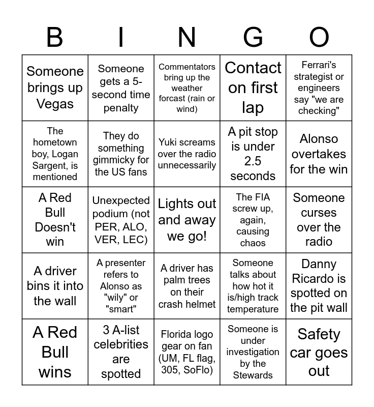 This bingo card has a free space and 24 words: A presenter refers to Alonso as "wily" or "smart", 3 A-list celebrities are spotted, Yuki screams over the radio unnecessarily, A Red Bull wins, Ferrari's strategist or engineers say "we are checking", Someone brings up Vegas, The hometown boy, Logan Sargent, is mentioned, Someone gets a 5-second time penalty, The FIA screw up, again, causing chaos, A driver has palm trees on their crash helmet, A pit stop is under 2.5 seconds, A Red Bull Doesn't win, Someone talks about how hot it is/high track temperature, Danny Ricardo is spotted on the pit wall, They do something gimmicky for the US fans, Someone is under investigation by the Stewards, Someone curses over the radio, Commentators bring up the weather forcast (rain or wind), Alonso overtakes for the win, Unexpected podium (not PER, ALO, VER, LEC), Safety car goes out, A driver bins it into the wall, Contact on first lap and Florida logo gear on fan (UM, FL flag, 305, SoFlo).