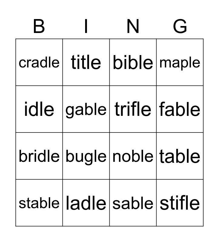 This bingo card has 16 words: ladle, table, bible, cradle, bridle, title, noble, sable, idle, gable, stable, maple, bugle, fable, trifle and stifle.