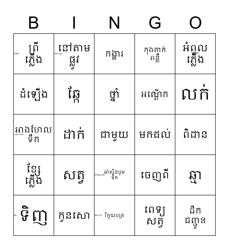 This bingo card has 12 images and 25 words: សត្វ, វិក្កយបត្រ, ថ្នាំ, ទិញ, អំពូលភ្លើង, ព្រីភ្លើង, ដំឡើង, នៅតាមផ្លូវ, មកដល់, ម៉ាស៊ីនបូមទឹក, អណ្តើក, អាងហែលទឹក, ចេញពី, ឆ្មា, ឆ្កែ, ដឹកជញ្ជូន, ពិដាន, កង្ហារ, លក់, ដាក់, ជាមួយ, កូនសោ, ខ្សែភ្លើង, កុងតាក់ពន្លឺ and ពេទ្យសត្វ.