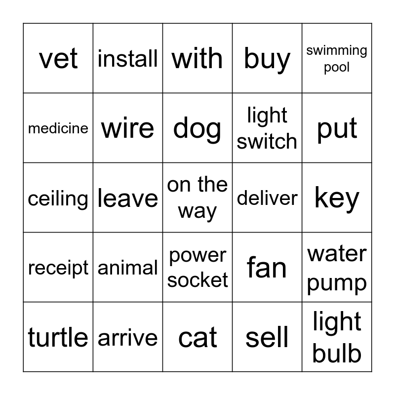 This bingo card has 25 words: animal, cat, dog, turtle, swimming pool, vet, medicine, install, deliver, power socket, light switch, ceiling, fan, water pump, wire, light bulb, key, with, put, leave, on the way, arrive, receipt, buy and sell.