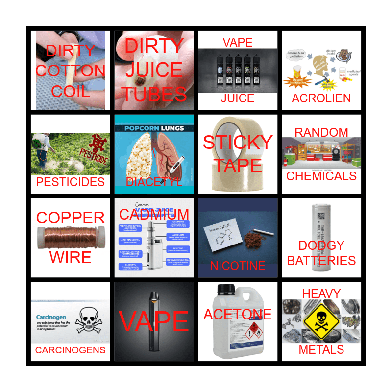 This bingo card has 16 images and 16 words: VAPE, DODGY BATTERIES, VAPE JUICE, DIRTY COTTON COIL, COPPER WIRE, DIRTY JUICE TUBES, NICOTINE, ACETONE, PESTICIDES, \ DIACETYL, CARCINOGENS, ACROLIEN, CADMIUM, RANDOM CHEMICALS, STICKY TAPE and HEAVY METALS.