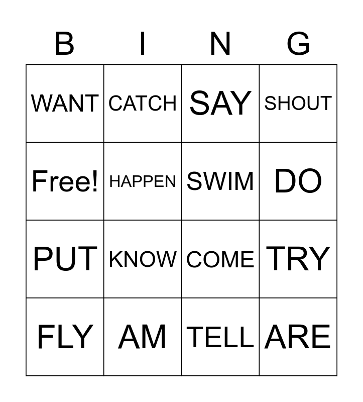 This bingo card has 16 words: AM, TRY, SAY, WANT, PUT, CATCH, COME, TELL, Free!, HAPPEN, FLY, SHOUT, KNOW, DO, SWIM and ARE.