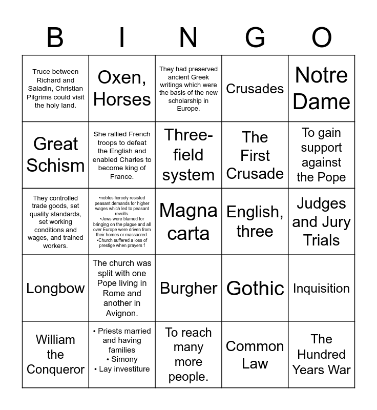 This bingo card has a free space and 30 words: • Priests married and having families • Simony • Lay investiture, The Children’s Crusade, •nobles fiercely resisted peasant demands for higher wages which led to peasant revolts. •Jews were blamed for bringing on the plague and all over Europe were driven from their homes or massacred. •Church suffered a loss of prestige when prayers f, By organizing and demanding privileges like freedom from some tolls and the right to govern the town., Truce between Richard and Saladin, Christian Pilgrims could visit the holy land., They had preserved ancient Greek writings which were the basis of the new scholarship in Europe., She rallied French troops to defeat the English and enabled Charles to become king of France., Burgher, English, three, To reach many more people., Judges and Jury Trials, The Hundred Years War, Common Law, No taxation without representation, trial by jury, and protection of the law., To gain support against the Pope, Vernacular, Gothic, Longbow, The church was split with one Pope living in Rome and another in Avignon., Notre Dame, They controlled trade goods, set quality standards, set working conditions and wages, and trained workers., •Town populations fell. •trade declined and prices rose. •serfs left the manor in search of better wages., Oxen, Horses, The First Crusade, Great Schism, Crusades, Inquisition, William the Conqueror, Three-field system and A French Peasant girl, moved by God to rescue France from its English conquerors.