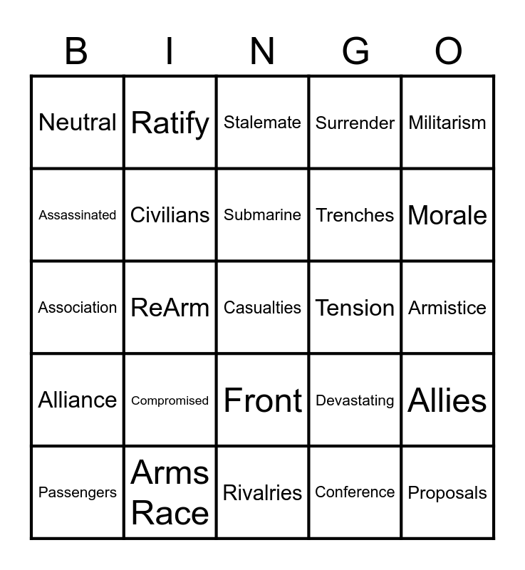 This bingo card has 25 words: Alliance, Arms Race, Casualties, Conference, Militarism, Neutral, Ratify, Stalemate, Tension, Allies, Assassinated, Civilians, Rivalries, Devastating, Morale, Passengers, ReArm, Submarine, Trenches, Armistice, Association, Compromised, Front, Surrender and Proposals.
