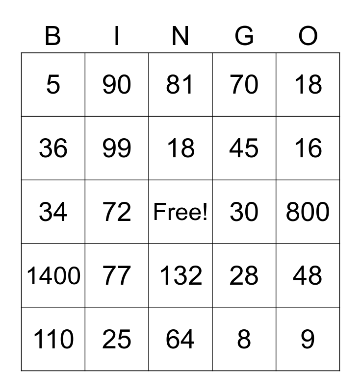 This bingo card has a free space and 52 words: 17, 9, 24, 64, 77, 144, 90, 6, 36, 49, 99, 400, 48, 28, 300, 21, 18, 30, 10, 18, 72, 8, 5, 45, 63, 42, 12, 6, 16, 32, 56, 70, 40, 100, 80, 81, 25, 54, 18, 14, 3000, 800, 1400, 90, 132, 484, 15, 34, 200, 72, 110 and 7.
